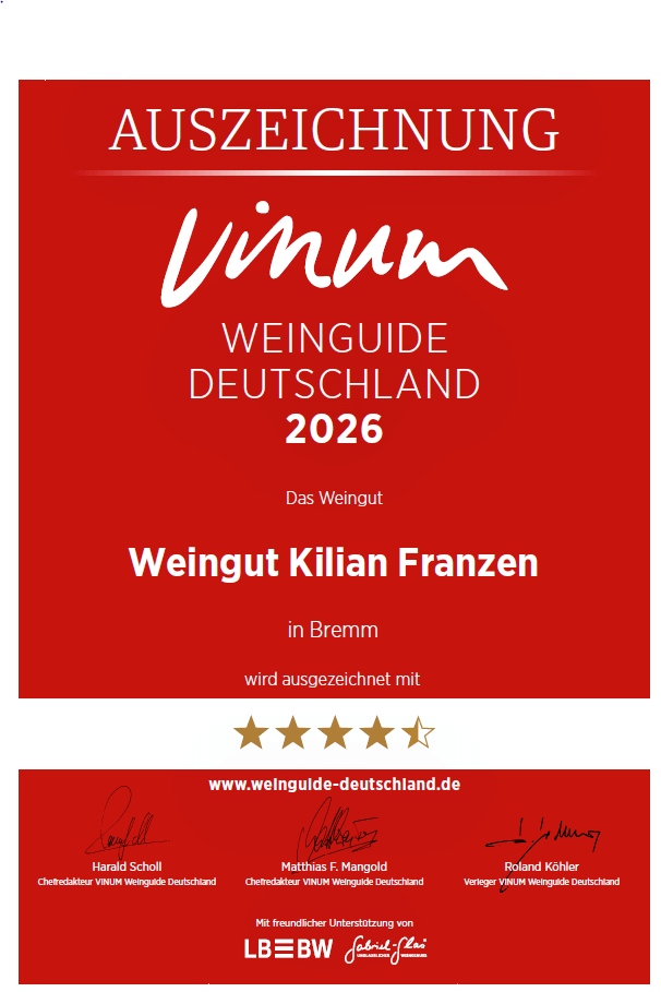 Wieder ein großer Auftritt der trockenen Rieslinge vom Weingut Franzen aus Bremm, dort, wo es den steilsten Weinberg Europas zu besuchen gilt. Und am besten gleich auch das Weingut, um im Ortskern von Bremm in Emmis Weinbar die Weine dieses Ausnahmewinzers kennenzulernen. Alles was hier Großes Gewächs heißt, hat in der diesjährigen Probe 94 oder mehr Punkte erreicht. Wie jedes Jahr bieten die Basislagenweine Neefer Frauenberg und Bremmer Calmont ein unschlagbares Preis-Genussverhältnis und bilden das geschmackliche Eingangstor in den einzigartigen Rieslingstil des Hauses. Etwas druckvoller als der Neefer Frauenberg tritt der Bremmer Calmont mit Jahrgang 2023 auf und hat deshalb, wie im letzten Jahr auch, im direkten Vergleich die Nase vorn. Wie Kilian Franzen es schafft, seinen Weinen diese für das Gut typische seidige Leichtigkeit einzuhauchen, bleibt uns ein Rätsel. Und das mit einer berückenden Frische, sogar bei den 2022ern. „Schlafende, ruhende Riesen im inneren Einklang mit sich selbst“, formulierten wir leicht pathetisch, weil so beeindruckt von den Großen Gewächsen Fachkaul und Sterneberg aus dem Jahrgang 2022. Wir hatten sie schon im Vorjahr im Glas, sie haben nichts an ihrer Spannkraft verloren. Hier wird Ruhe und Zeitlosigkeit im Wein zum geschmacklichen Prinzip erhoben. Genug der Pathetik, zu den Fakten: Mit Freude vergeben wir einen zusätzlichen halben Stern nach Bremm. Dazu passt es natürlich auch, dass wir das Weingut Franzen in diesem Jahr für den Titel „Weingut des Jahres“ nominiert hatten.