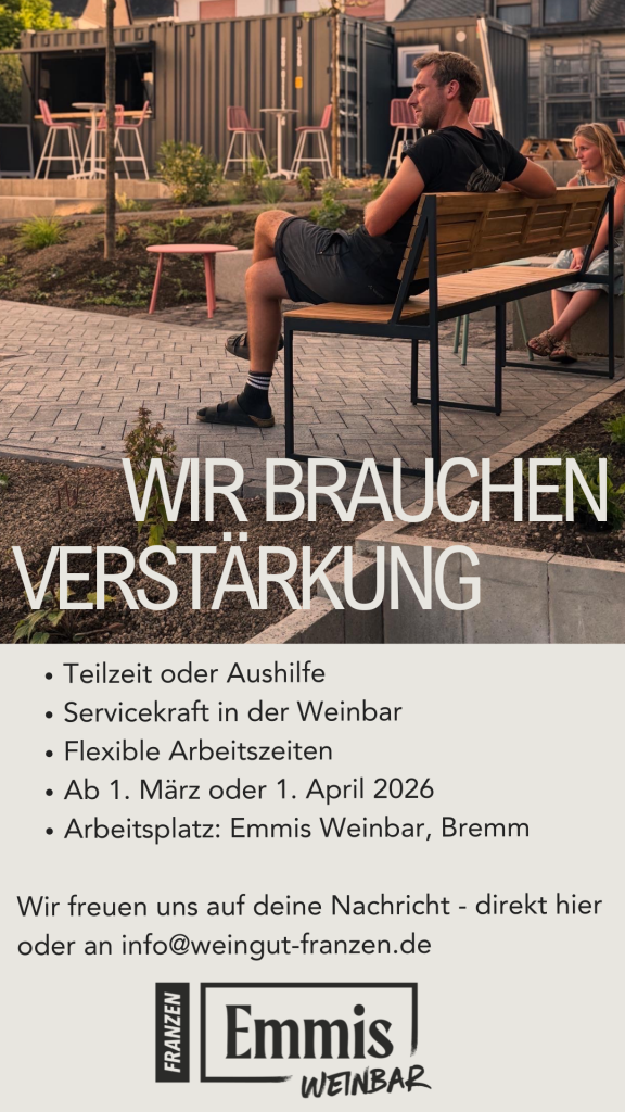 Du bist freundlich, fleißig und liebst es, mit Menschen zu arbeiten? Dann bist du bei uns genau richtig! Werde Teil unseres Teams und unterstütze uns in Emmi’s Weinbar – Spaß, gute Stimmung und leckere Weine inklusive.